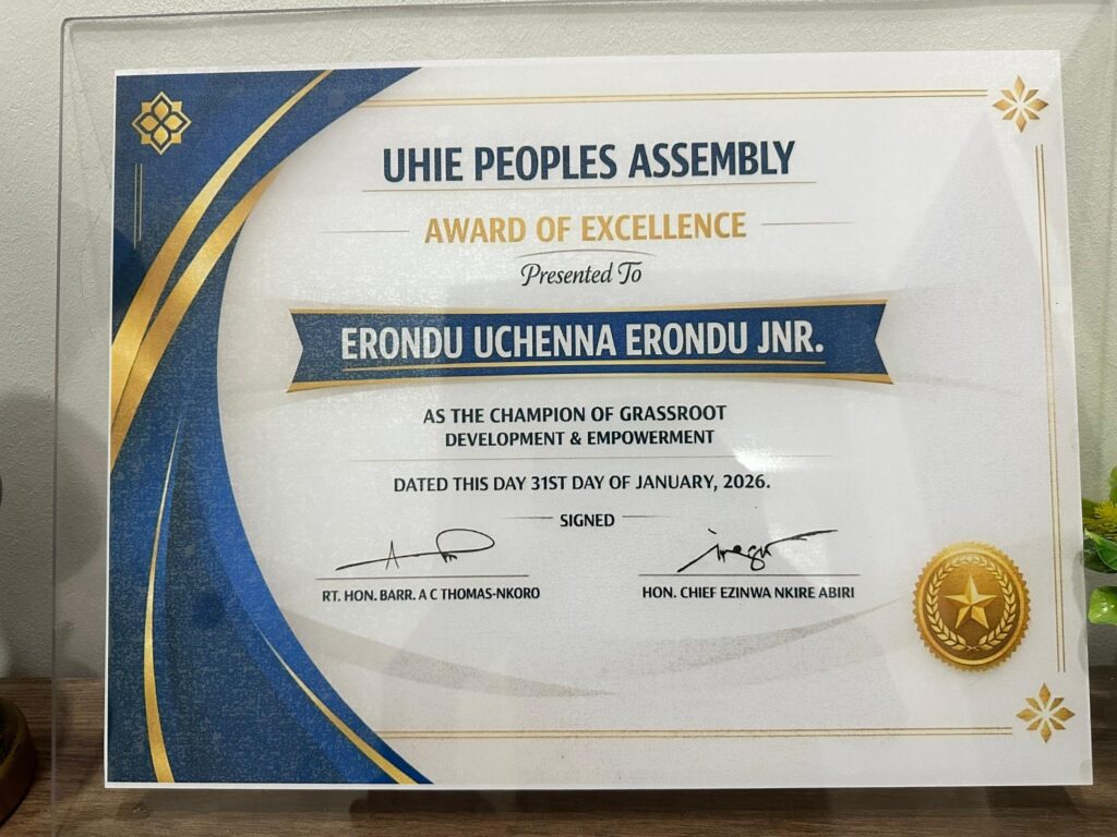 The event also witnessed the presentation of an award of Excellence to Hon. Erondu Jnr. as the Champion of Grassroots Development and Empowerment by the Uhie People’s Assembly, presented by the Leader Chief Ezinwa Nkire Abiri.